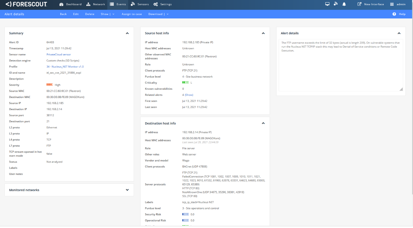 eyeInspect can detect exploitation attempts against devices running Nucleus using the new “NUCLEUS:13 Monitor” script. The figure below shows the alert raised by eyeInspect when it detects an exploitation attempt against CVE-2021-31886.