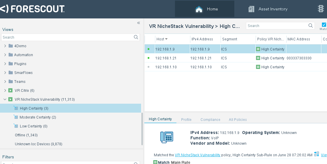 - HTTP and Telnet fingerprint matches give High Certainty. Known vulnerable vendor/models that are classified by Forescout are also used to give High Certainty matches.