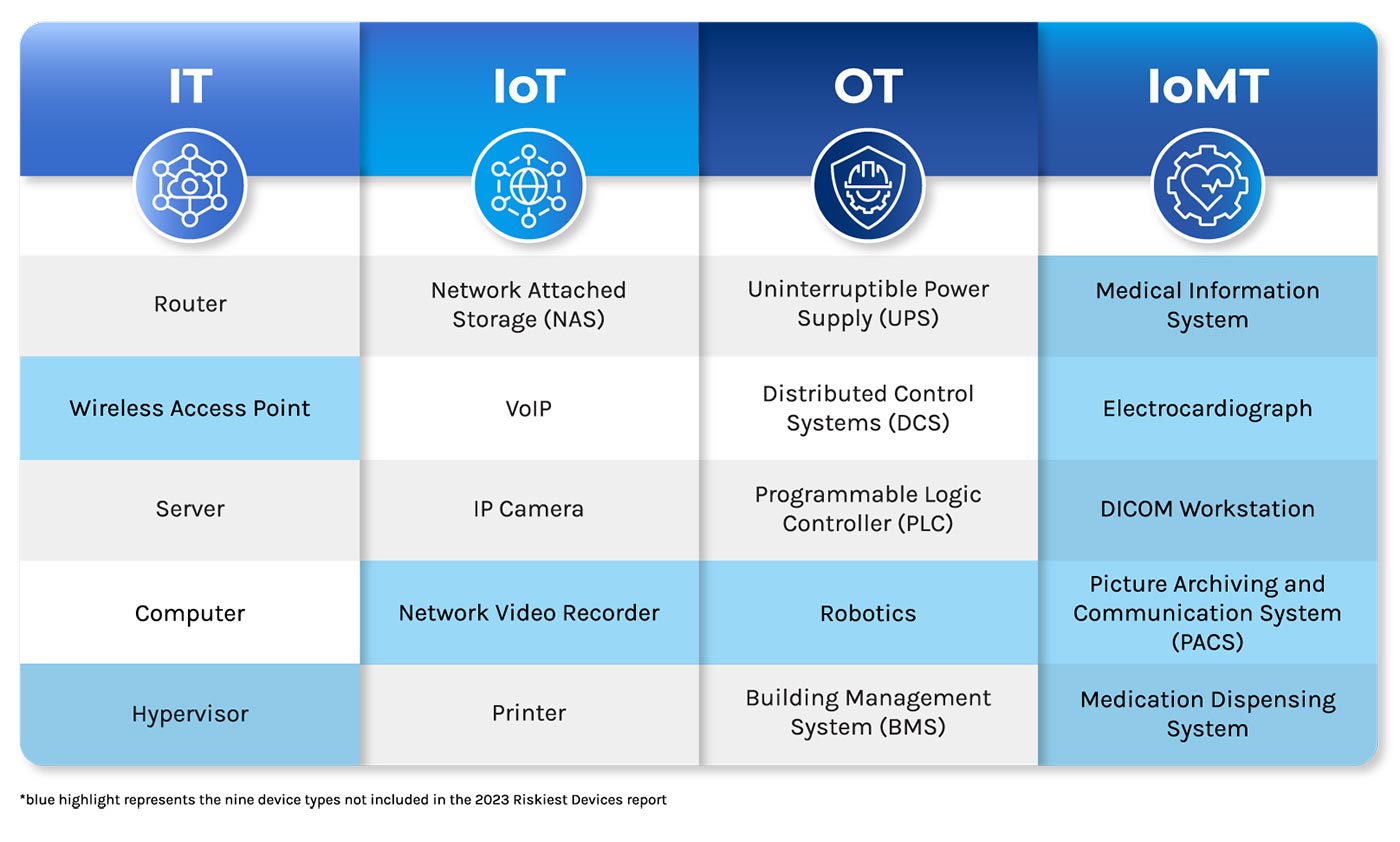 We have identified the five riskiest device types in four device categories: IT, IoT, OT and IoMT — for a total of 20 device types. Out of these 20 types, 11 were included in the 2023 report and remain on the list. Nine device types are new: wireless access points, hypervisors, NVRs, robotics — and every device in the IoMT category.