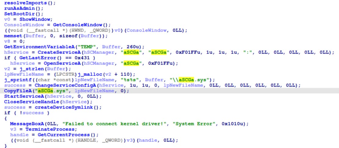 | 2JSqT5dzNXW.exe | d9a24f5c62928dd9f5900b4a9d8ce9e09b73509bc75537c223532ebf8c22e76d | An executable that loads a malicious driver (aSCGa.sys) and issues commands to it. |